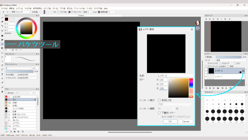8bitレイヤーを追加(レイヤー2)し、バケツツールを使い黒で塗りつぶし。