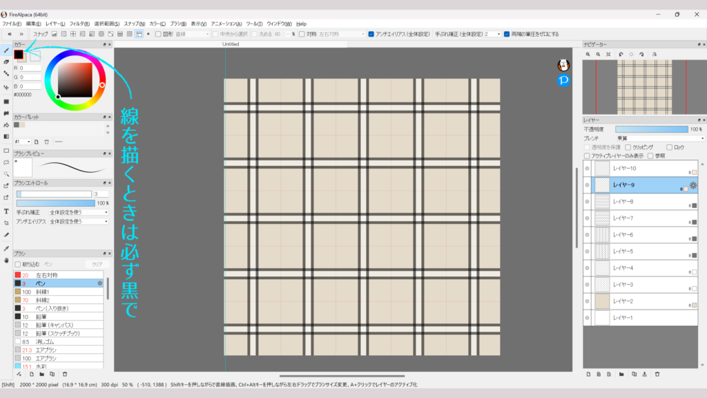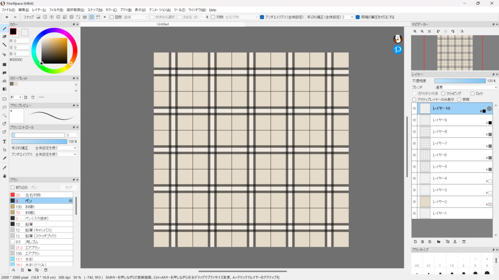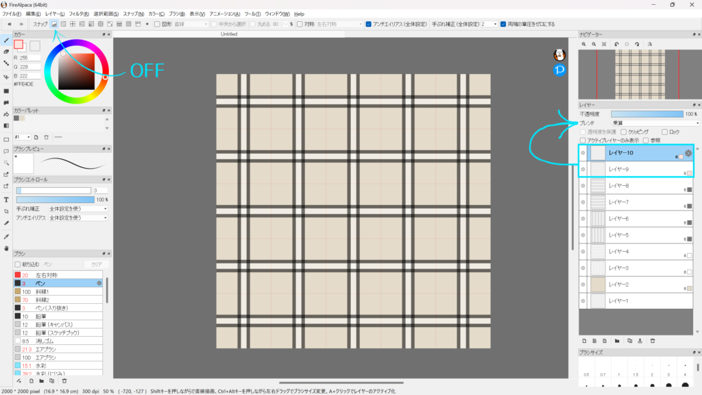 レイヤー10も同じように、今度は設定パネルで「水平/横」をオンにして「位置:10 pixel」に設定し、横線を1本描くと