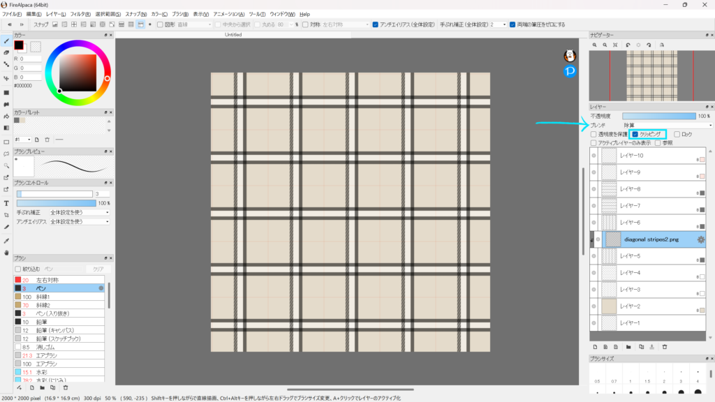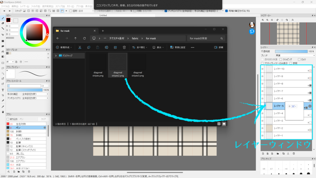 このテクスチャの中の「diagonal stripes2」をレイヤーウィンドウにドラッグ&ドロップしレイヤー5の上に移動