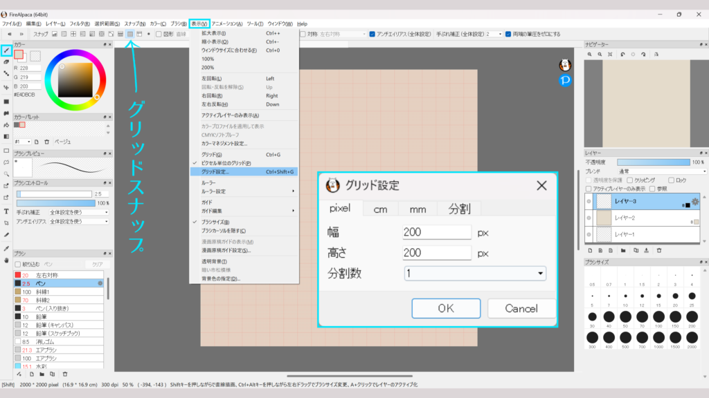 「メニューバー:表示 > グリッド設定」で、グリッドの縦横の間隔を設定。