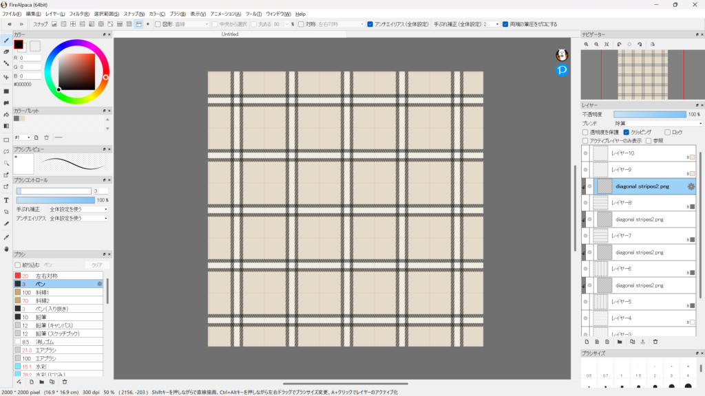 本当は全作業をFireAlpacaだけで行いたかったのですが、FireAlpacaは細かい線を引くことがあまり得意ではないようなので、Inkscapeというドローツールを使って斜めストライプ柄の透過テクスチャを作成しました。