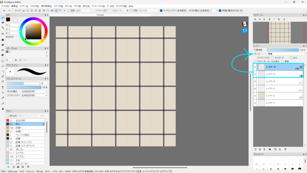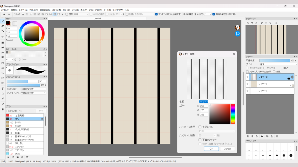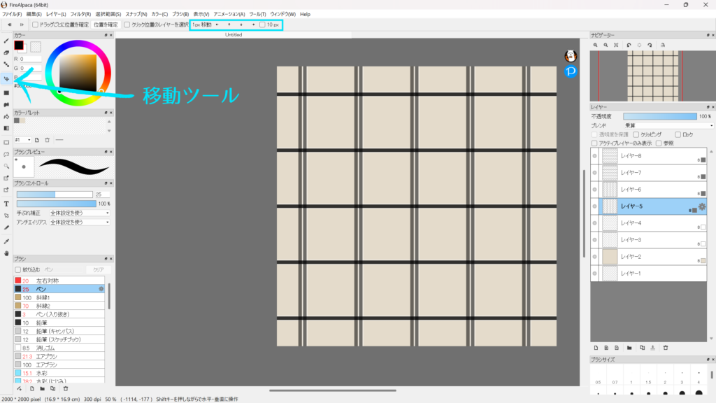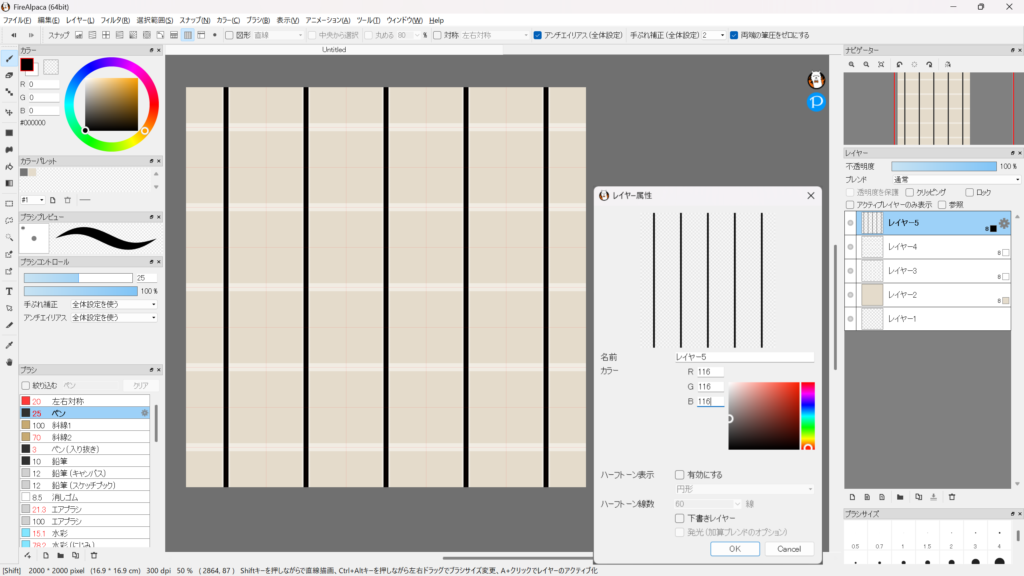 8bitレイヤーを追加(レイヤー5)。ブラシを選択し、レイヤー3・4よりも細いブラシサイズにして同じように縦線を引き、色を設定。