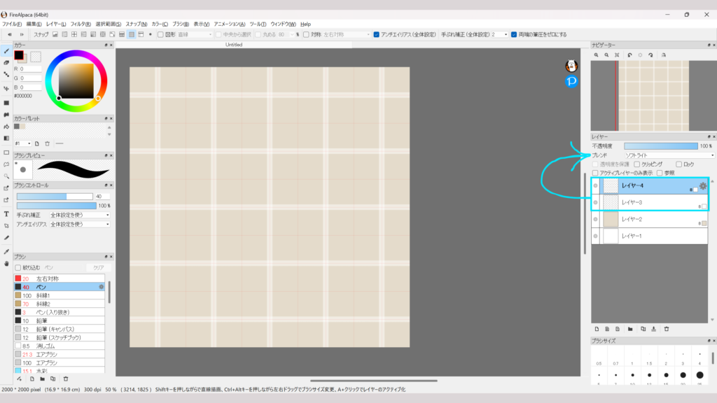 そしてレイヤー3と4のブレンドを「ソフトライト」に。