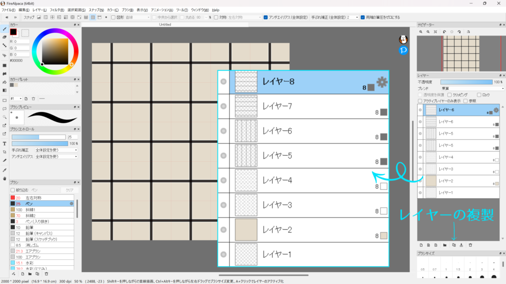 8bitレイヤーを追加(レイヤー3)し、ブラシツールに戻します。
