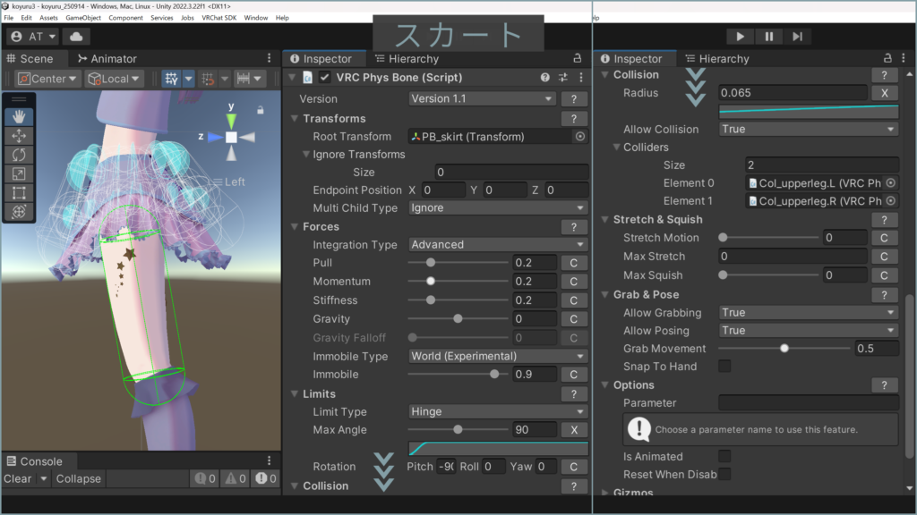 本題のPhysBoneのパラメータとコライダー設定。
