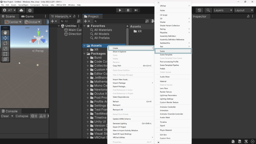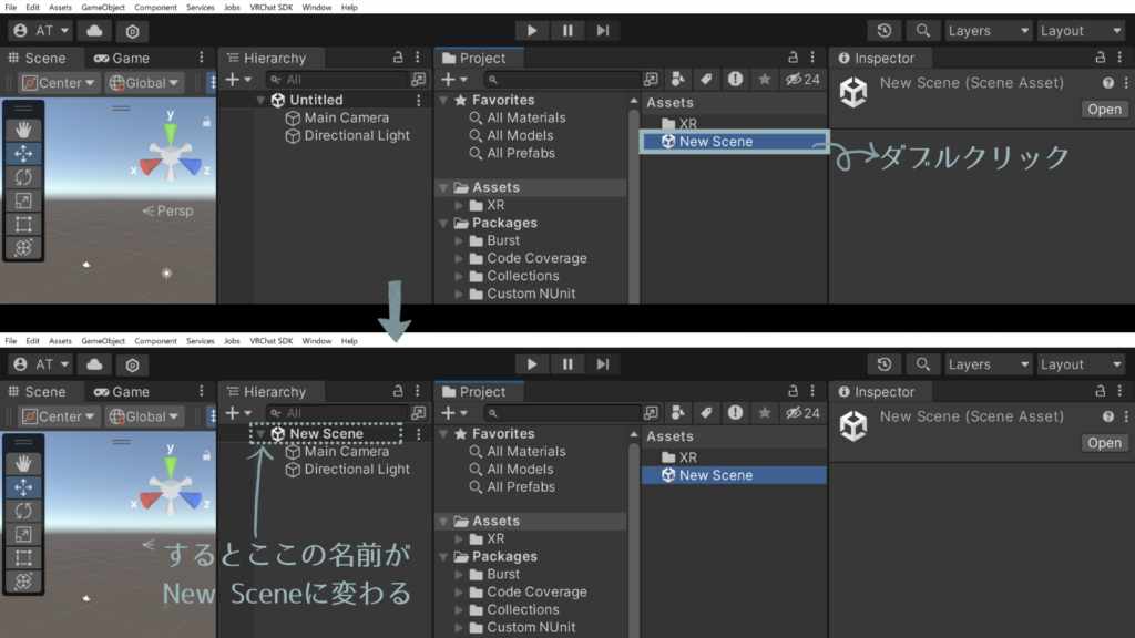 この「New Scene」をダブルクリックすると、Hierarchyタブの一番上のScene名が「Unlitled」から「New Scene」に変更される