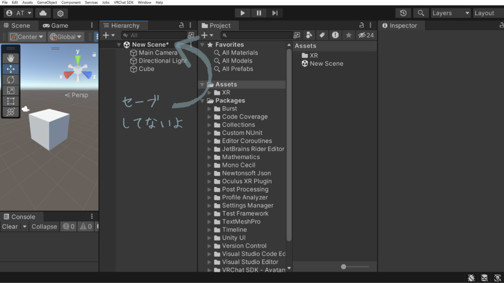 Scene(Hierarchy)タブに何か変更が加えられると「Hierarchy」の一番上の「Sceneマーク + 名前」に*(アスタリスク)がつくので、ここでセーブの有無を判断できる