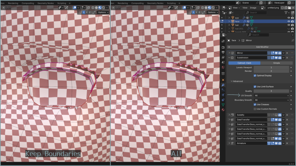 3Dビュー上でテンキーじゃない方の「1」で面マスクモードにし、白目の上にカーソルを置いて「L」キーをクリックすると白目だけ選択される