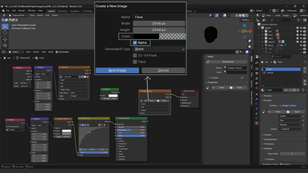 テクスチャ作成のポイントは「Color」のAlpha値を0にしておくことと、「Alpha」のチェックを入れておくこと