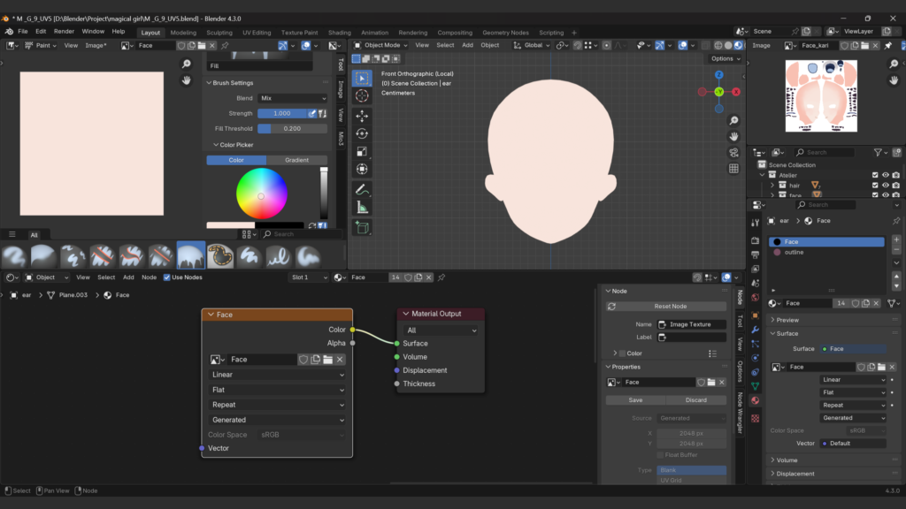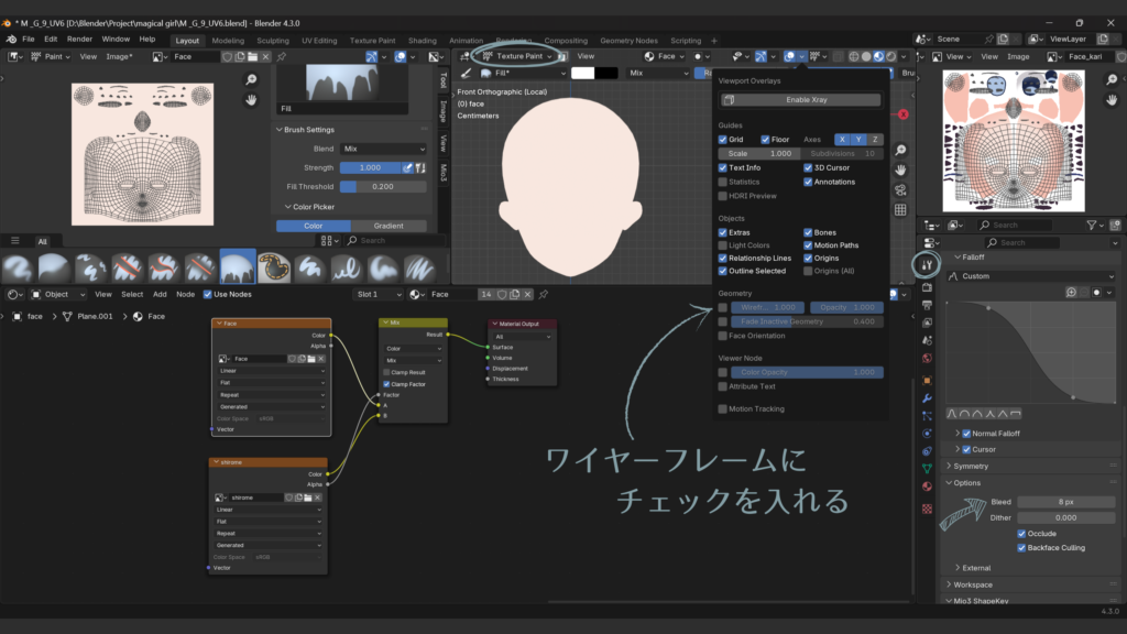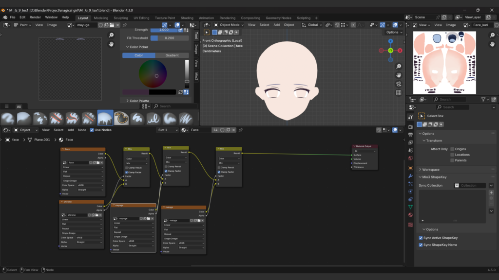 Faceと白目のテクスチャをMix Colorノードで繋ぐ